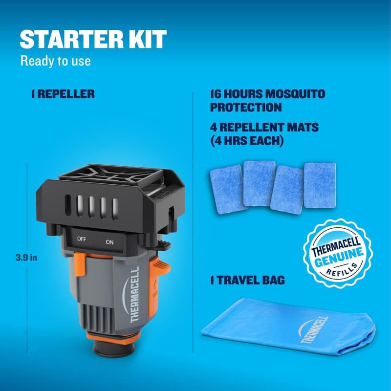 INCLUDES: One repeller, four 4-hour repellent mats (16 hours of repellent), and one water-resistant travel bag. Requires camping gas canister (not included).