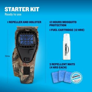 INCLUDES: One rugged repeller, one camo holster, one clip, one 12-hour fuel cartridge, and three 4-hour repellent mats.