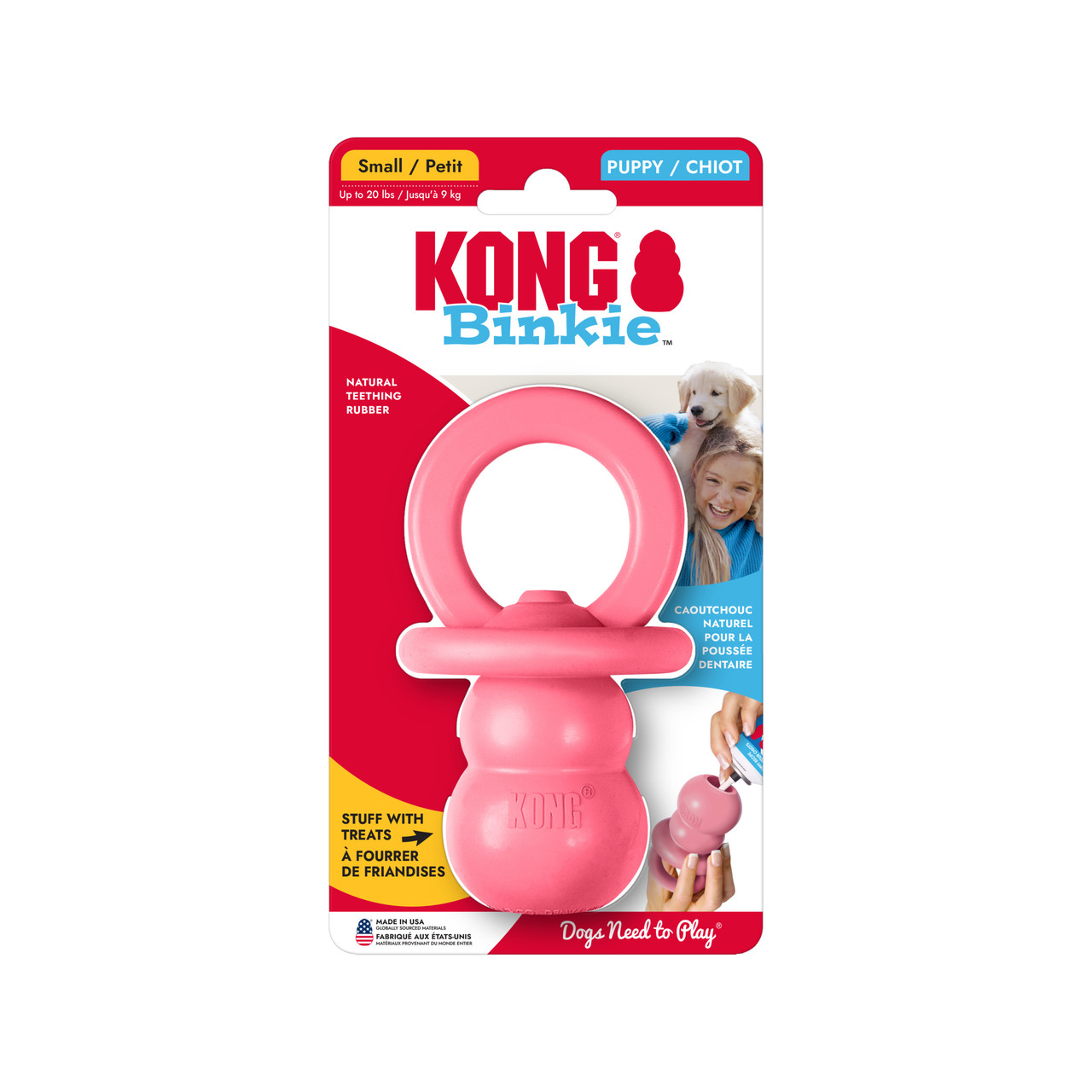 The KONG Binkie? helps teach puppies appropriate chewing behavior. Made from the KONG Classic unique puppy rubber, this toy fulfills instinctual needs to chew while easing aching teeth and gums. The ability to fill the center turns this toy into a fun treat dispensing challenge. Want to extend chew sessions? Stuff with KONG Puppy Snacks? and KONG Puppy Easy Treat?.