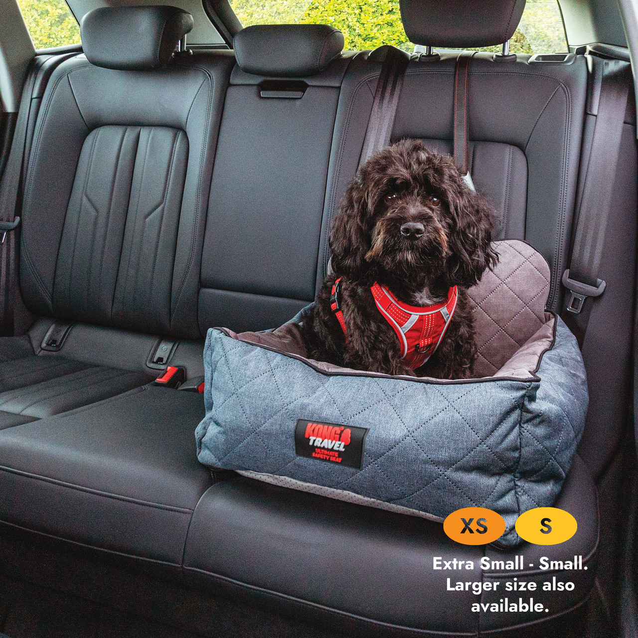 Traveling with your puppy or small dog and more comfortable with the KONG Ultimate Safety Seat. This all-in-one pet car seat provides a sumptuous and safe place for your dog, ensuring they have absolute warmth and comfort also keeping them safely restrained during the ride. We believe that the KONG Ultimate Seat is the safest dog seat available and is a huge step forward in the safety of both dog and passengers in transit. Many other seats have a very flimsy tether which is simply stitched into the seat itself and under braking there is no direct anchor of your dog to a safety system. The key difference with this product is that the main emphasis of the item is the integration with our Ultimate Safety Tether which is a 3 point tether system that fixes into your baby seat anchor points This item connects directly to your dog??s harness. The seat itself is sturdily built around the tether, we believe that protection of your dog is paramount and the primary function is to securely tether your dog. Of course the seat itself is beautiful, plush, very comfortable and of the very highest quality.