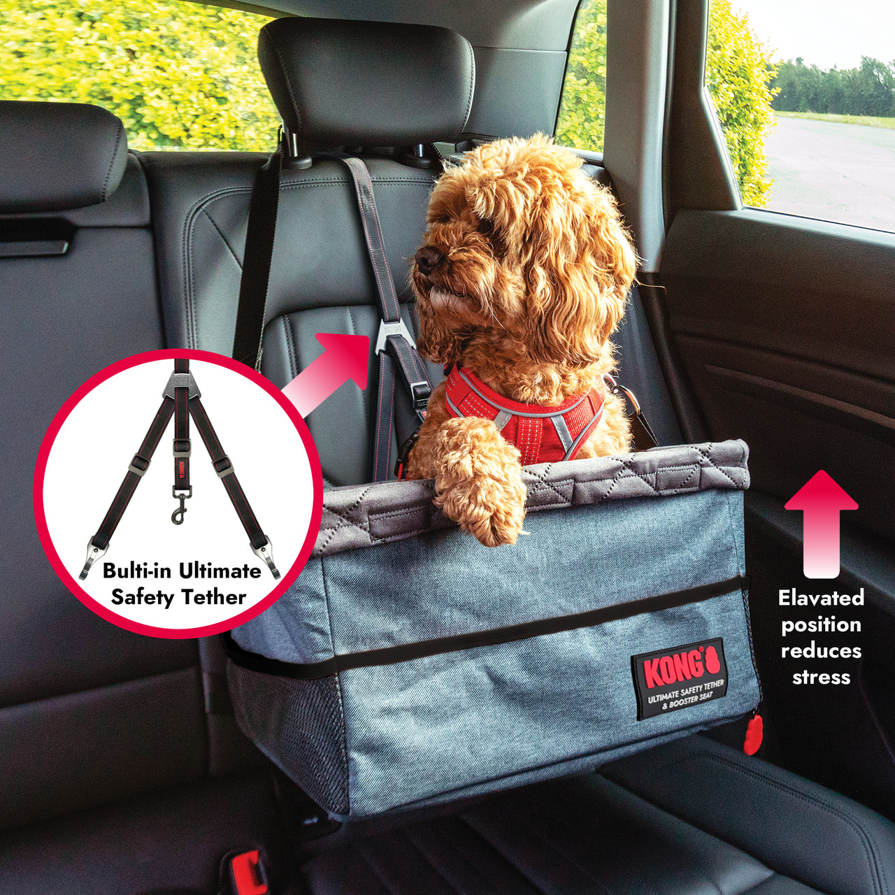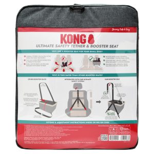 Designed for puppies and small dogs. Traveling with your dog just got safer and more comfortable with the KONG Ultimate Safety Tether & Booster Seat providing a secure, elevated position for your dog, ensuring they have a clear view of their surroundings and keeping them safely restrained during the ride.We believe that this is the safest dog booster seat available and is a huge step forward in the safety of both dog and passengers in transit. Many other booster seats have a very flimsy tether which is simply stitched into the booster seat itself and under braking there is no direct anchor of your dog to a safety system. The difference with this product is that the main emphasis of the item is the integration with our Ultimate Safety Tether which is a 3-point tether system that fixes into your baby seat anchor points. The tether connects directly to your dog??s harness. The seat itself is sturdily built around the tether, we believe that protection of your dog is paramount and the primary function is to securely tether your dog. Of course, the seat itself is plush and very comfortable, beautifully designed and of the very highest quality.