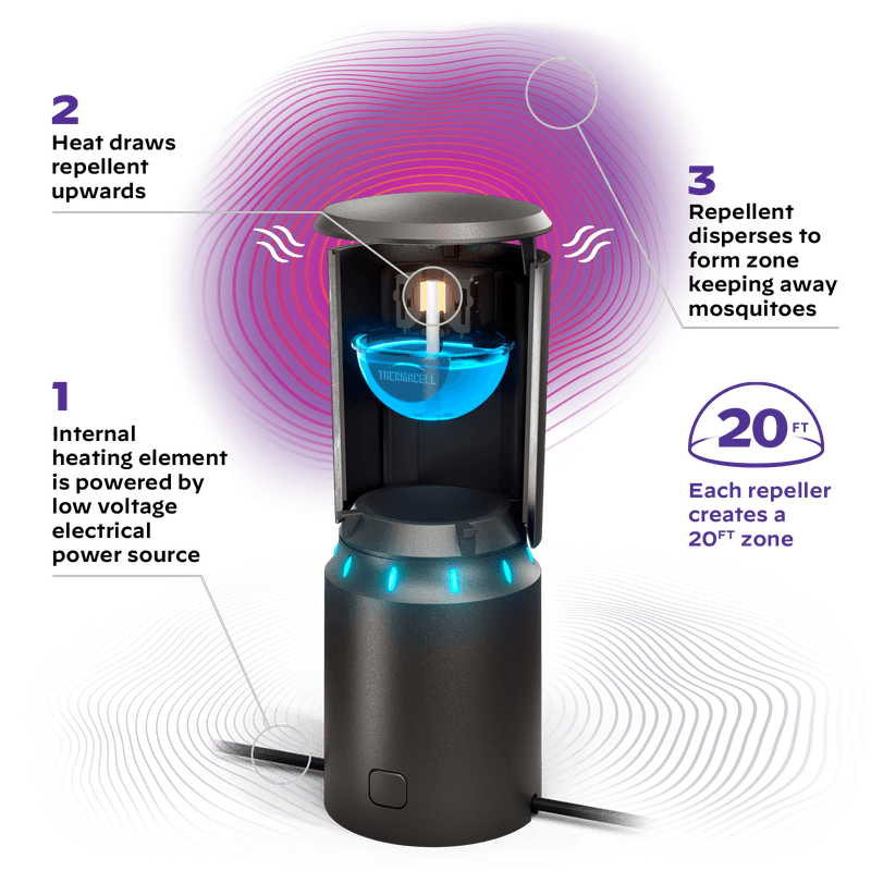 The Thermacell LIV Repeller is the point of protection in your outdoor spaces.When used with Thermacell Mosquito Repellent, a 20ft zone (315 sq ft) of mosquito protection is created, protecting you and your family from the harmful effects of mosquitoes.